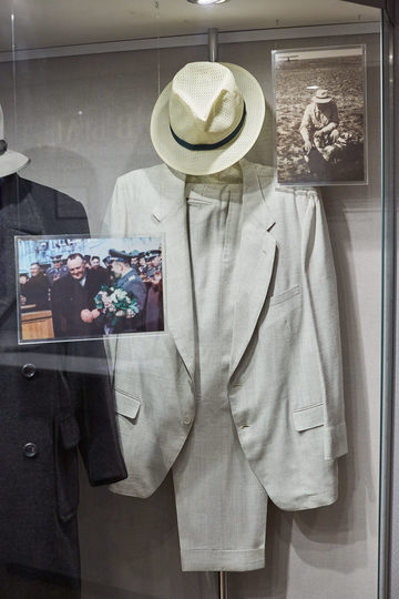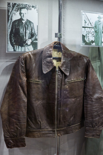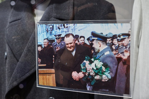 Выставка открывается витриной с одеждой Сергея Павловича. Эти вещи музей экспонирует впервые. К счастью, удалось подобрать фотографии разных лет, на которых Королёв запечатлён именно в том плаще или пальто, или куртке, что передала в музей Нина Ивановна Королёва, и сотрудники музея их бережно хранят уже более 40 лет.