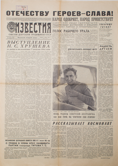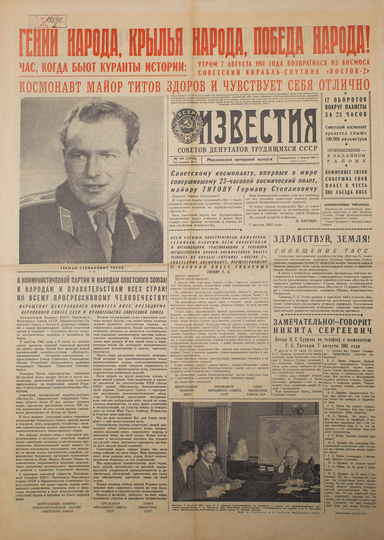 6 августа 1961 года в Советском Союзе с космодрома Байконур был осуществлен запуск космического корабля «Восток-2», пилотируемого гражданином СССР Титовым Германом Степановичем. Состоялся второй в истории космонавтики полет корабля с человеком на борту.