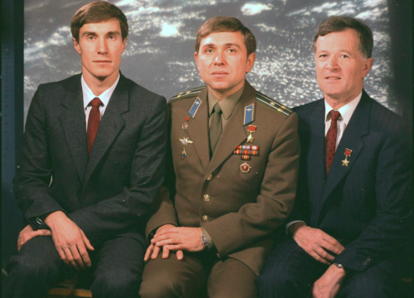 Международный экипаж СССР-Франция: Сергей Крикалёв, Александр Волков и Жан-Лу Кретьен (Франция). Фото Альберта Пушкарёва из фондов Музея космонавтики.
