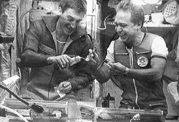 Сергей Крикалёв и Александр Волков на борту орбитальной станции «Мир», февраль 1992 года.