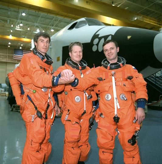 Экипаж корабля STS-60 «Discovery» (сверху вниз): Роналд Сега, Сергей Крикалёв, Франклин Чанг-Диаз, Джен Дейвис, Кеннетт Райтлер и Чарлз Болден.