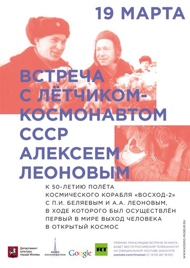 19 марта с 14:00 до 19:00 на официальном YouTube-аккаунте телеканала RT будет доступна прямая трансляция из Музея космонавтики в Москве, где пройдут празднования 50-й годовщины выхода человека в космос.