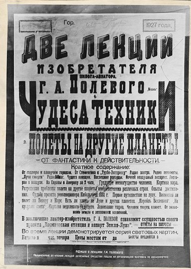 Так, выставка 1927 года стала самым крупным делом энтузиастов-межпланетчиков. Инициаторы выставки из секции межпланетных сообщений: изобретатель и летчик Георгий Андреевич Полевой и автор проекта ракетомобиля Александр Яковлевич Федоров ставили перед собой цель продвигать идеи Циолковского.