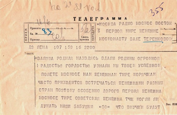 «Валюша, родная, находясь вдали от родины, с огромной радостью мы узнали о твоём успешном полёте в космос. Нам женщинам-морячкам часто приходиться встречаться с женщинами разных стран. Поэтому особенно дорого первая женщина в космосе – советская женщина. Могли ли думать наши бабушки, что внучки будут командовать океанскими кораблями, осваивать антарктиду, управлять госудраством, летать в космос. Ведь даже в сказках – эта роль отводилась мужчине...».