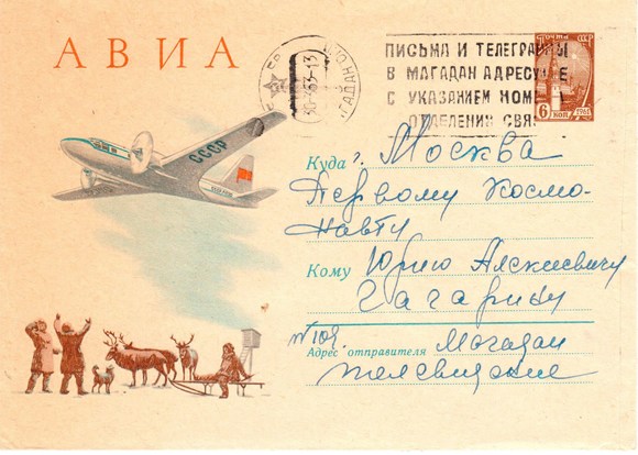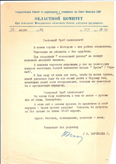 «В нашем городе – Магадане – все ребята космонавты. Увлечение не обошлось и без курьёзов. При очередных «испытаниях ракеты» на воздух взлетела школьная теплица. В поисках горючего мальчишки у нас на телестудии выкрали несколько частей киноленты фильма «Враги»/ Горький/. Я Вам пишу об этом для того, чтобы Вы могли судить, какой радостью была бы для наших ребят к Первому Мая, несколько ваших слов поздравления, которые мы поместили бы в праздничную передачу».
