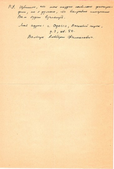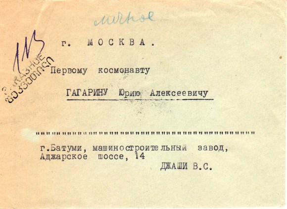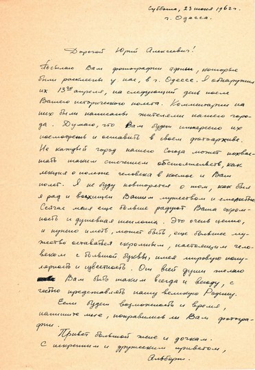 «Дорогой Юрий Алексеевич! Посылаю Вам фотографии, которые были расклеяны у нас в г. Одессе. Я обнаружил их 13-го апреля, на следующий день после Вашего исторического полёта. Комментарии на них были написаны жителями нашего города. Думаю, что Вам будет интересно их посмотреть и оставить в своем фотоархиве. Не каждый город нашего Союза может похвастать таким стечением обстоятельств, как лекция о полёте человека в космос и Ваш полёт. Я не буду повторяться о том, как я был рад и восхищен Вашим мужеством и смелостью. Сейчас меня ещё больше радует Ваша скромность и душевная теплость...».