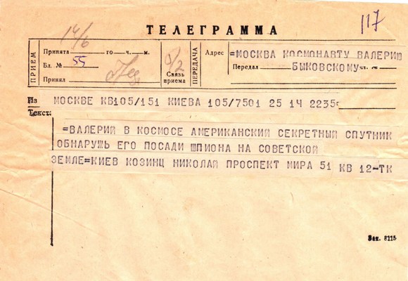 «Валерий, в космосе американский секретный спутник. Обнаружь его, посади шпиона на советской земле».