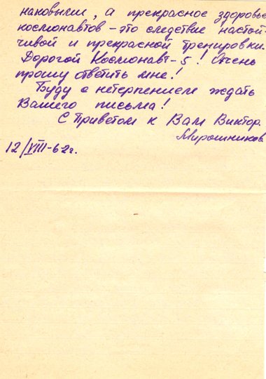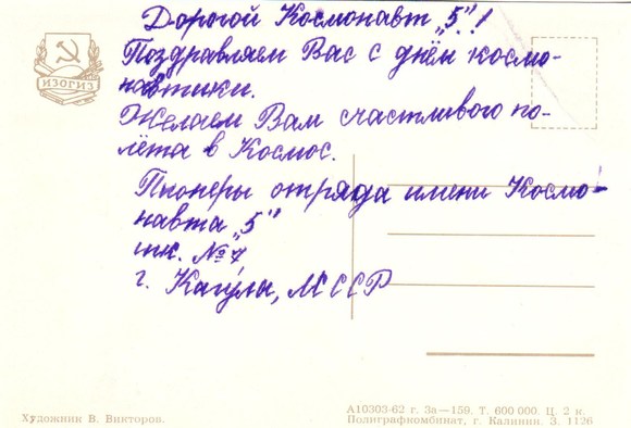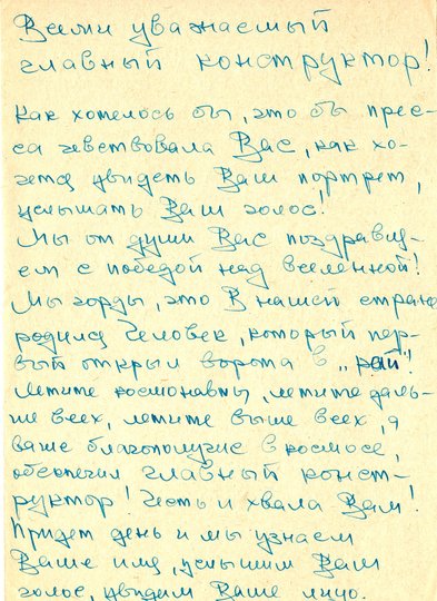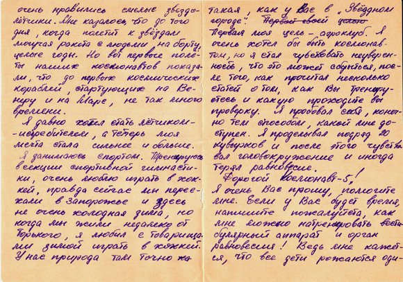 «... Мне 11 лет, я учусь отлично. Наш пионерский отряд носит Ваше имя – отряд имени Будущего космонавта №5. Мы стараемся учиться на "отлично" и "хорошо", чтобы вас не позорить. Мы думаем, что вы полетите в 1963 году и с нетерпением ждём Вашего полёта..».