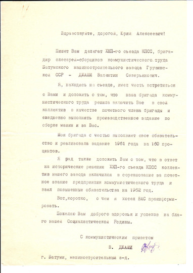 «...Я, находясь на съезде, имел честь встретиться с Вами и доложить о том, что наша бригада коммунистического труда решила включить Вас в свой коллектив в качестве почётного бригады и ежедневно выполнять производственное задание по сборке машин и за Вас. Моя бригада с честью выполняет свое обязательство и реализовала задание 1961 года на 160 процентов...».