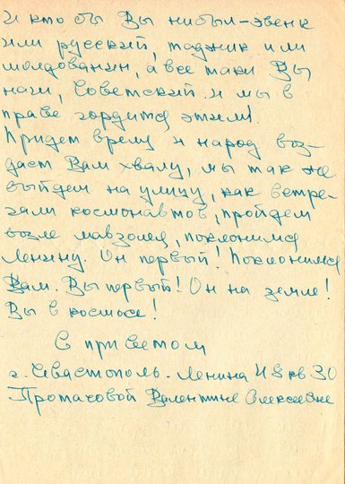 «...И кто бы Вы ни был – эвенк или русский, таджик или молдаванин, а все-таки Вы наш, Советский и мы вправе гордиться этим! Придет время и народ воздаст Вам хвалу, мы также выйдем на улицы, как встречали космонавтов, пройдем возле мавзолея, поклонимся Ленину. Он первый! Поклонимся Вам. Вы первый! Он на Земле! Вы в космосе!».