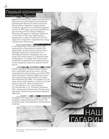 Совместный проект Музея космонавтики и общероссийской молодежной общественной организации «МИР». Выставочный проект подготовлен в год 55-летия полёта первого человека в космос и предназначается для экспонирования в музеях, школах, университетах и других культурных и образовательных учреждениях.