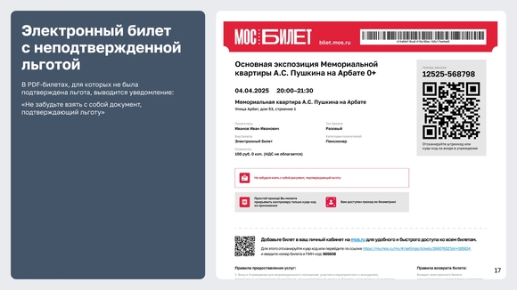В соответствии с утвержденным Перечнем льгот от 1 марта 2025 г. Постановление Правительства Москвы от 29 августа 2017 г. № 594-ПП, Приказом Департамента культуры города Москвы и Департамента образования и науки города Москвы от 14 сентября 2023г. № 673/ОД/859 |